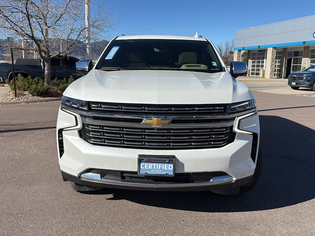 This Certified 2024 Chevrolet Tahoe Premier, has a Iridescent Pearl Tricoat exterior and an Jet Black/Maple Sugar interior color. 14,380 miles. Stock Number N349942. You can connect with us by calling (719) 249-2703. **CERTIFIED PRE-OWNED** No Accidents! One Owner! Important Package and Feature Information Max Trailering PackageExtra Capacity Cooling SystemAdvanced Trailering PackageIntegrated Trailer Brake ControllerHitch View with Pan/zoom Image AdjustmentSmart Trailer Integration IndicatorTrailer Side Blind Zone AlertPremium Package ($4,090 value)Dual-Pane Power Panoramic SunroofPreferred Equipment Group 1LZMemory SettingsFront High-Back Reclining Bucket Seats3rd Row 60/40 Power-Folding Split-Bench SeatPower Release 2nd Row Bucket SeatsDriver and Front Outboard Passenger AirbagsChrome Door Handles with Body-Color StripColor-Keyed Carpeting Floor Covering1st and 2nd Row Color-Keyed Carpeted Floor MatsRemote StartBright Front and Rear Door Sill PlatesFloor ConsoleAuto-Dimming Inside Rearview MirrorChrome Mirror CapsOutside Heated Power-Adjustable MirrorsSafety Alert SeatChevrolet Infotainment 3 Premium System RadioHill Descent ControlWireless ChargingHeated 2nd Row Outboard SeatsHeated Steering WheelDual Exhaust SystemPower Tilt and Telescopic Steering ColumnWrapped Steering Wheel2-Speed Active Electronic Autotrac Transfer Case20" X 9" Polished Aluminum WheelsPerforated Leather Seat TrimLED Daytime Running LampsHands-Free Rear Power Programmable LiftgateSiriusXM with 360LEnhanced Driver Information CenterRear Cross Traffic AlertUniversal Home RemoteLane Change Alert with Side Blind Zone AlertBose 10-Speaker Centerpoint Surround Audio System Feature275/60R20SL All-Season Blackwall TiresMagnetic Ride Control SuspensionEnhanced Display and Alert PackageRear Camera Mirror WasherInside Rearview Auo-Dimming Rear Camera MirrorRear Pedestrian AlertHD Surround Vision15" Diagonal Multi-Color Head-Up Display Safety and Security Forward collision mitigation - Forward thinking. You look away for just a second and suddenly the vehicle in front of you has stopped. That's when the forward collision mitigation system comes to life. When it senses an impending impact, it will activate a combination of features to help prevent or reduce the severity of an accident. Forward collision mitigation is always looking ahead. Forward collision mitigation - Forward thinking. You look away for just a second and suddenly the vehicle in front of you has stopped. That's when the forward collision mitigation system comes to life. When it senses an impending impact, it will activate a combination of features to help prevent or reduce the severity of an accident. Forward collision mitigation is always looking ahead. Pedestrian impact prevention - An extra step toward safety. Pedestrians don't always stop, look, and listen, but with Pedestrian Impact Prevention, your vehicle is equipped to better see them and avoid them. This system constantly monitors the road ahead to identify and track pedestrians. It projects that image to an interior display screen, AND should an impact become likely, Pedestrian impact prevention takes steps to avoid a collision.Technology and Telematics Apple CarPlay/Android Auto smart device wireless mirroring Mobile hotspot - WiFi on the fly. Connect your devices to the Internet through your vehicles private mobile hotspot and take the internet wherever your journey takes you, without eating up your data allowance. Find the hotspot with mobile hotspot. EMISSIONS, FEDERAL REQUIREMENTS, EMISSIONS OVERRIDE, CALIFORNIA, ENGINE, 5.3L ECOTEC3 V8, TRANSMISSION, 10-SPEED AUTOMATIC, GVWR, 7500 LBS. (3402 KG), REAR AXLE, 3.23 RATIO, WHEELS, 20" X 9" (50.8 CM X 22.9 CM) POLISHED ALUMINUM, TIRES, 275/60R20SL ALL-SEASON, BLACKWALL, SEATS, FRONT BUCKET, JET BLACK/MAPLE SUGAR, PERFORATED LEATHER SEATING SURFACES 1ST AND 2ND ROW, AUDIO SYSTEM, CHEVROLET INFOTAINMENT 3 PREMIUM SYSTEM WITH GOOGLE BUILT-IN COMPATABILITY, PREMIUM PACKAGE, ENHANCED DISPLAY