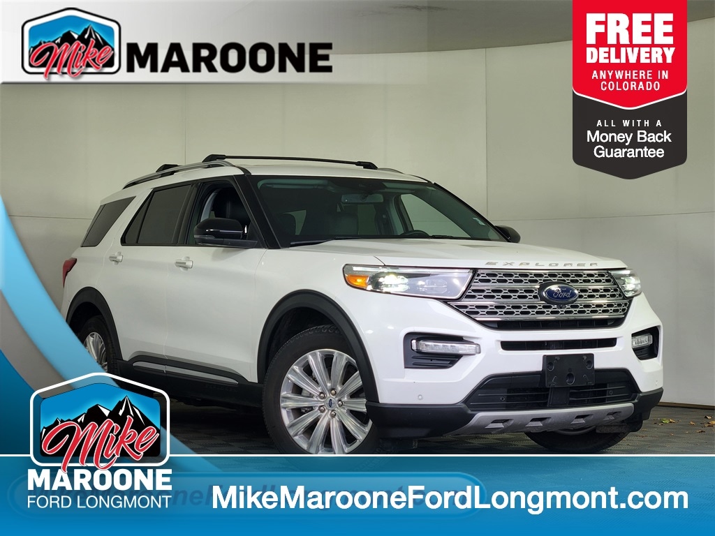 Recent Arrival at Mike Maroone Ford! FREE DELIVERY ANYWHERE IN COLORADO, 4 WHEEL DRIVE, NAVIGATION, REMOTE START, HEATED SEATS, KEYLESS IGNITION, POWER SEATS, BLIND SPOT MONITOR, APPLE CARPLAY/ANDROID AUTO, BLUETOOTH/HANDS FREE, REAR BACKUP CAMERA, LOCAL TRADE, RARE FIND!!!, PRICED TO SELL!!!, Star White Metallic Tri-Coat exterior paint, Ebony leather-trimmed seats, 20" premium painted aluminum wheels, 2.3L EcoBoost Hybrid engine, Equipment Group 301A, Star White Metallic Clearcoat ($595), 50-state emissions, floor liners front and second row (removable carpet), front license plate bracket.. Odometer is 5483 miles below market average! White 2021 Ford Explorer Limited 4D Sport Utility 3.3L Hybrid 10-Speed Automatic 4WD