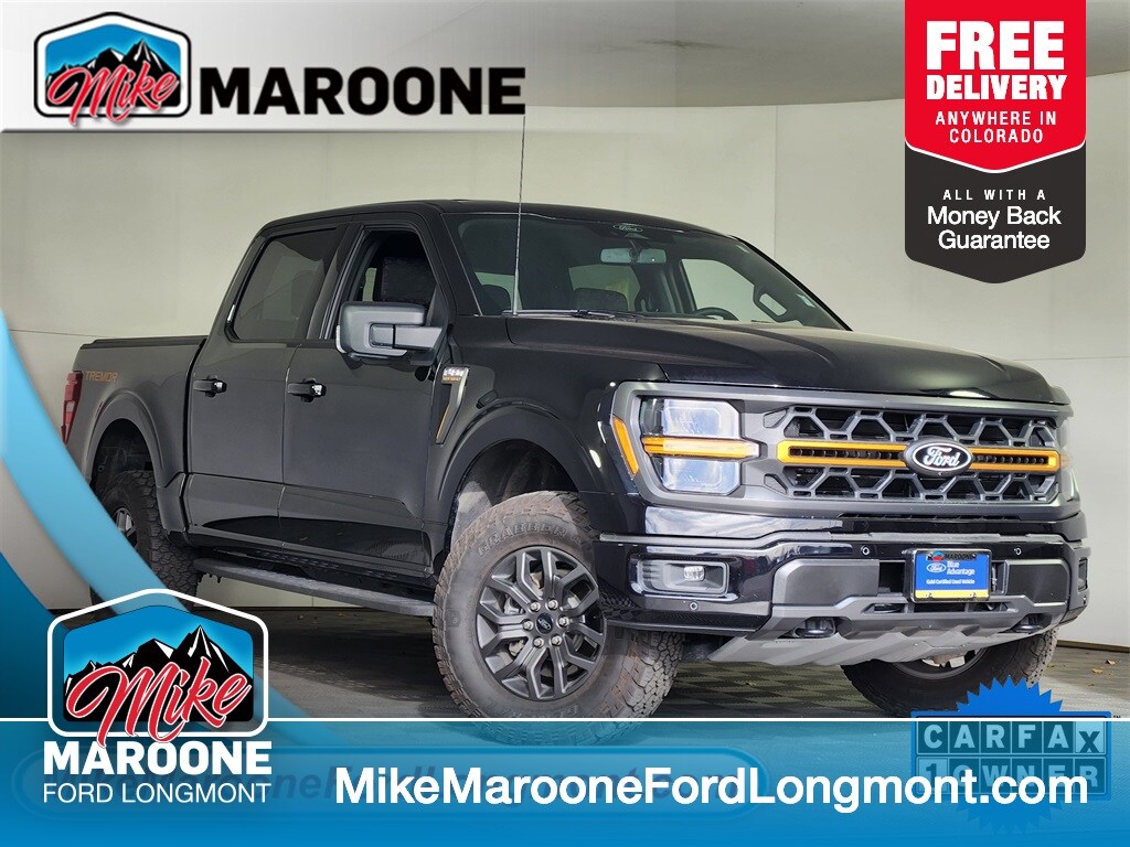 Recent Arrival at Mike Maroone Ford! Clean CARFAX. CARFAX One-Owner. FREE DELIVERY ANYWHERE IN COLORADO, 4 WHEEL DRIVE, NAVIGATION, REMOTE START, APPLE CARPLAY/ANDROID AUTO, Chrome step bars, 3.31 electronic lock rear axle, 275/65R 18 OWL all-terrain tires, 18 chrome-like PVD wheels, skid plates, FX4 Off-Road Package, Bed Utility Package, tailgate step. Agate Black Metallic 2024 Ford F-150 Tremor 4D SuperCrew 3.5L V6 EcoBoost 10-Speed Automatic 4WD