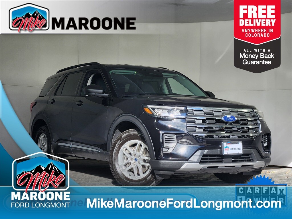 Recent Arrival at Mike Maroone Ford! CARFAX One-Owner. FREE DELIVERY ANYWHERE IN COLORADO, GOLD CERTIFIED, 4 WHEEL DRIVE, NAVIGATION, HEATED SEATS, KEYLESS IGNITION, APPLE CARPLAY/ANDROID AUTO, BLUETOOTH/HANDS FREE, REAR BACKUP CAMERA, Agate Black Metallic Exterior, Dark Space Gray Cloth Seats, 2.3L EcoBoost I-4 Engine, 10-Speed Automatic Transmission, 18" Silver Painted Aluminum Wheels, P255/65R18 A/S BSW Tires, 2nd Row Captains Chairs, Mini Spare and Jack Kit, Daytime Running Lamps (DRL), Front License Plate Bracket, Equipment Group 200A.. Black Metallic 2025 Ford Explorer Active 4D Sport Utility 2.3L EcoBoost I-4 10-Speed Automatic 4WD